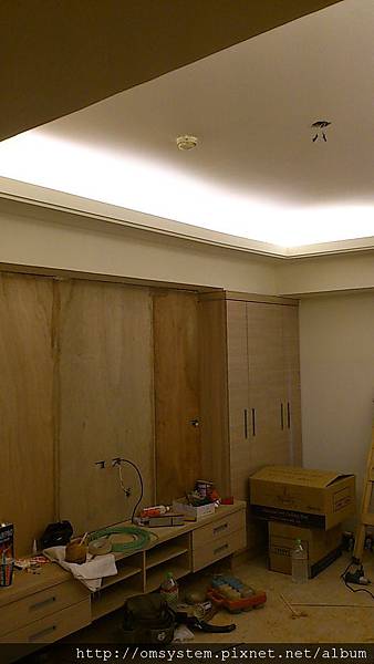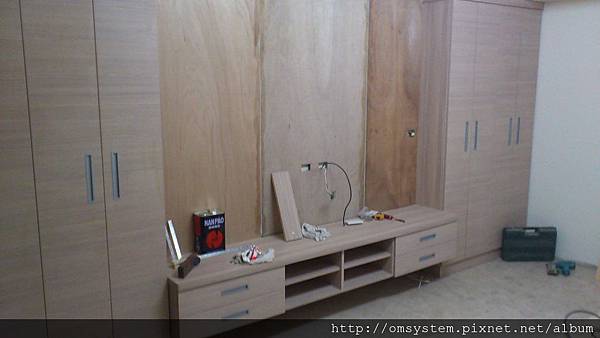 電視櫃ㄉ部分採用左右兩邊高櫃 中間矮櫃ㄉ部分使用吊櫃 左邊高貴非真實櫃體 其實是一支柱子